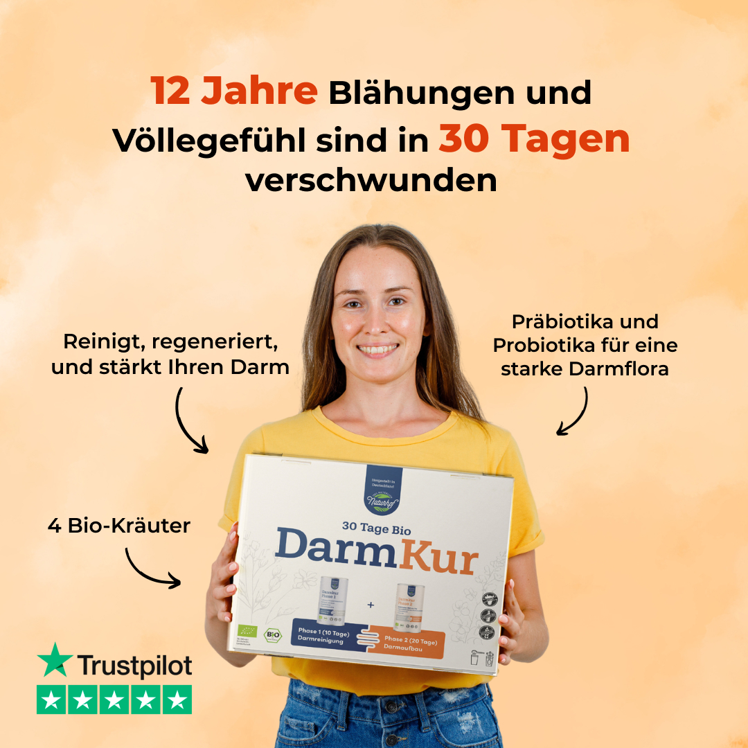 "Wow, was für ein Unterschied! Die Darmkur hat nicht nur meine Verdauungsprobleme gelöst, sondern auch meine Energie und Stimmung verbessert. Ich schlafe besser, fühle mich tagsüber wacher und meine Haut strahlt. Es ist, als hätte ich mein inneres Gleichgewicht und Wohlbefinden wiedererlangt." - Anja F., 33